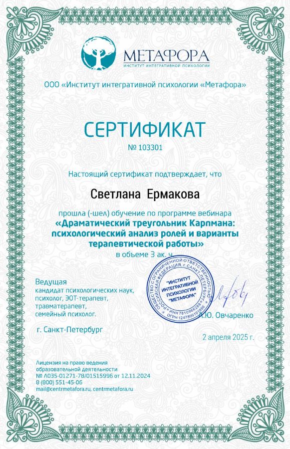 Здравствуйте! Меня зовут Светлана - клинический, кризисный и корпоративный психолог. Практикую краткосрочную мультимодальную терапию. Использую: КПТ, DBT, техники кризисного консультирования, трансовые методы.